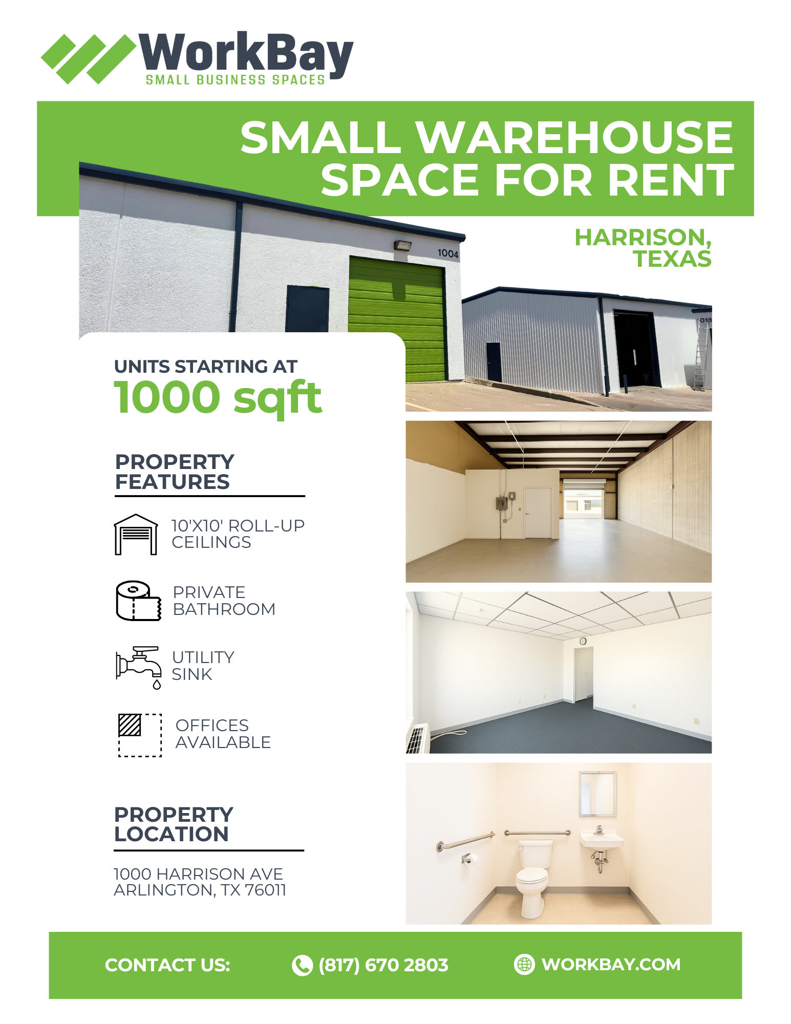 WorkBay – Harrison offers newly built warehouse units from around 1,000 to 2,200 square feet equipped with water, heavy 3-phase power, and private bathrooms. WorkBay spaces are immensely adaptable, with the opportunity to combine suites and build-out options like adding an office or HVAC.