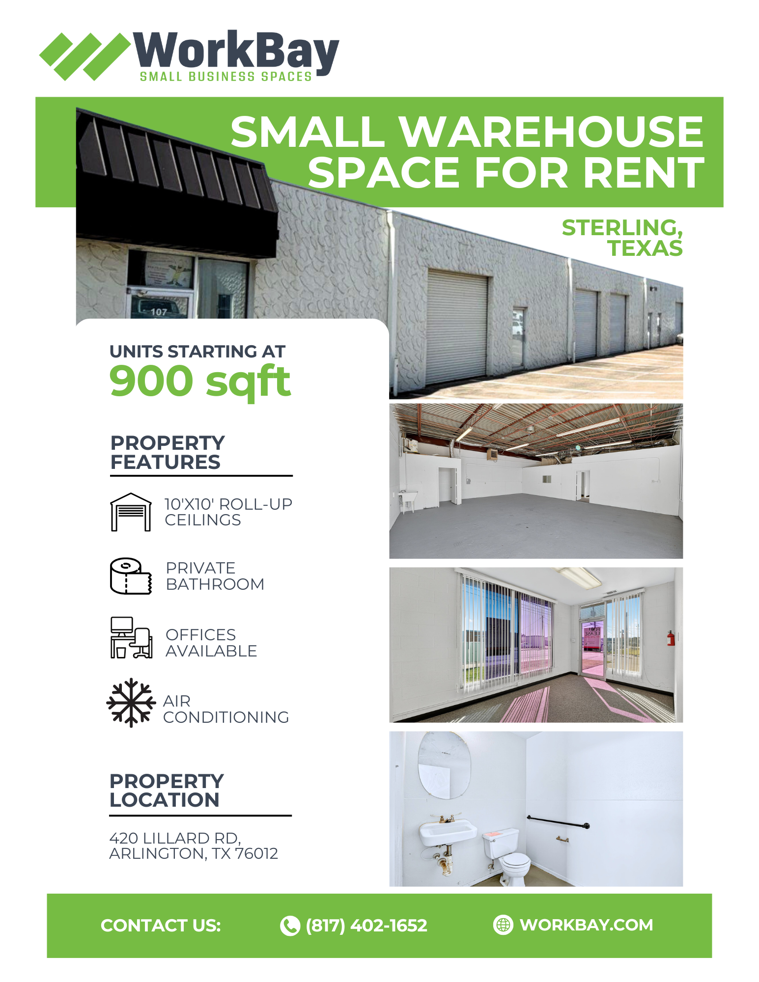 WorkBay – Sterling at 420 Lillard Rd presents a premier leasing opportunity for businesses seeking high-quality warehouse and flex space in a thriving Fort Worth corridor. Units range from 900 to 1,700 square feet and are designed to accommodate a wide range of uses, including light manufacturing, e-commerce, distribution, storage, specialty trades, mechanics, and boutique services.